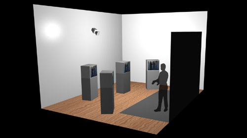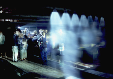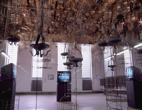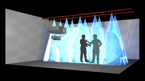 This installation occupies three locations, the chroma-key room at the Wilhelm Lehmbruck Museum in Duisburg, the changing room in the Waschkaue Herten and the shower room in the Waschkaue Herten. The audiences in Herten and Duisburg are connected in the following way: A video camera in Duisburg captures images of the audience standing in front of a chroma-key blue backdrop, this image is sent to Herten via an ISDN video conferencing system. The image is received in Herten and chroma-keyed together with a camera image of the audience in the Waschkaue changing room. The chroma-key mixed image is then video projected onto a fine wall of water, sprayed from high pressure shower heads in the Waschkaue shower room. A camera situated next to the projector captures an image of the projected image and feeds it to three monitors in the changing room space in the Waschkaue, and back via the ISDN video conferencing system to three video monitors in Duisburg.